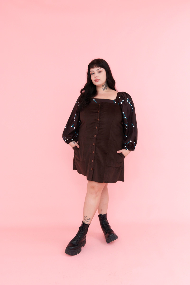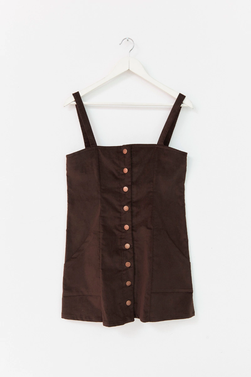 Jumper de corte recto con botones jeaneros en el centro y bolsillos en los laterales. Se regula el largo de los breteles con un boton en la espalda