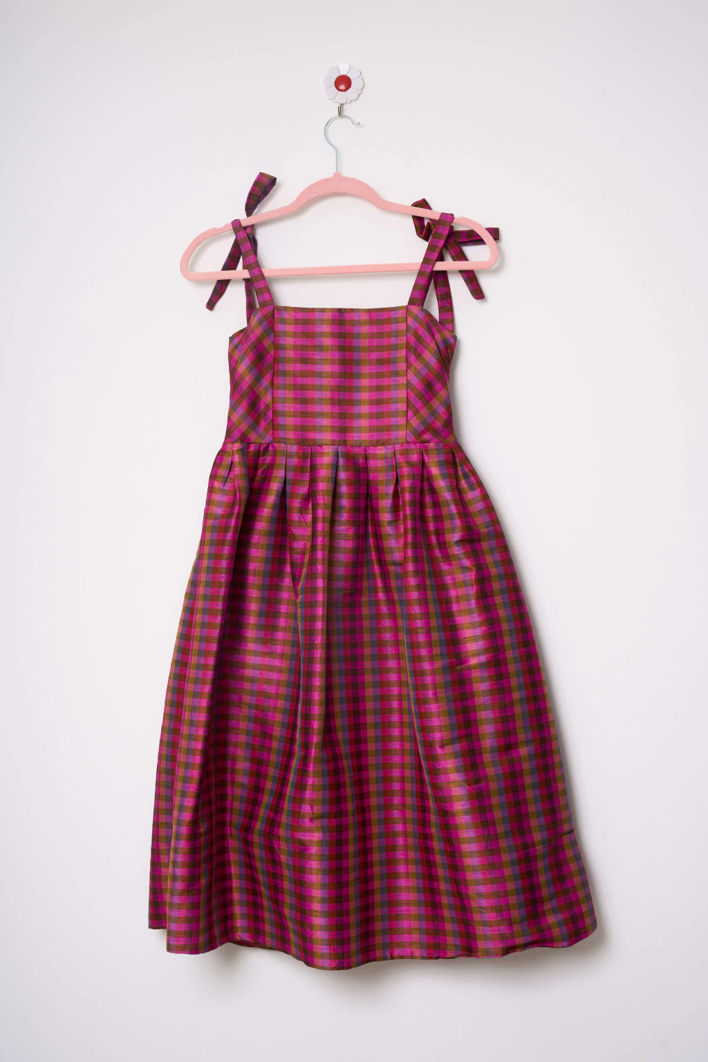 Vestido largo con breteles que se atan en el hombro y cierre invisible en la espalda. Tiene dos recortes de hilo elastico en la espalda para entallar. La falda tiene tablas pequeñas y queda super voluminosa y armada por las caracteristicas de la tela que si bien no es rigida no tiene caida