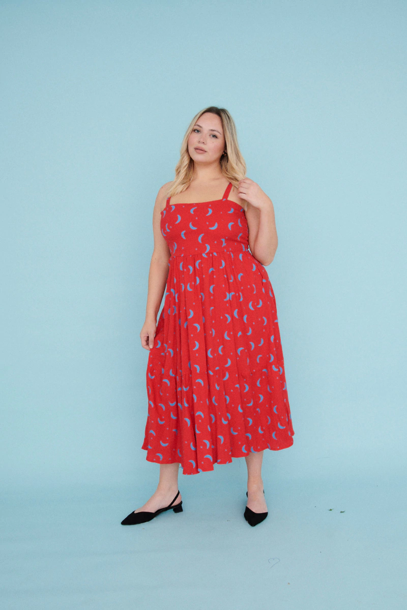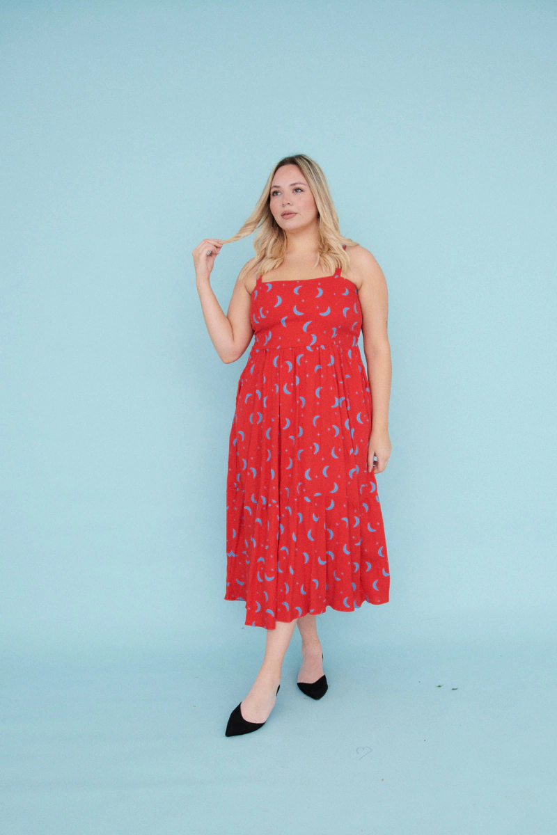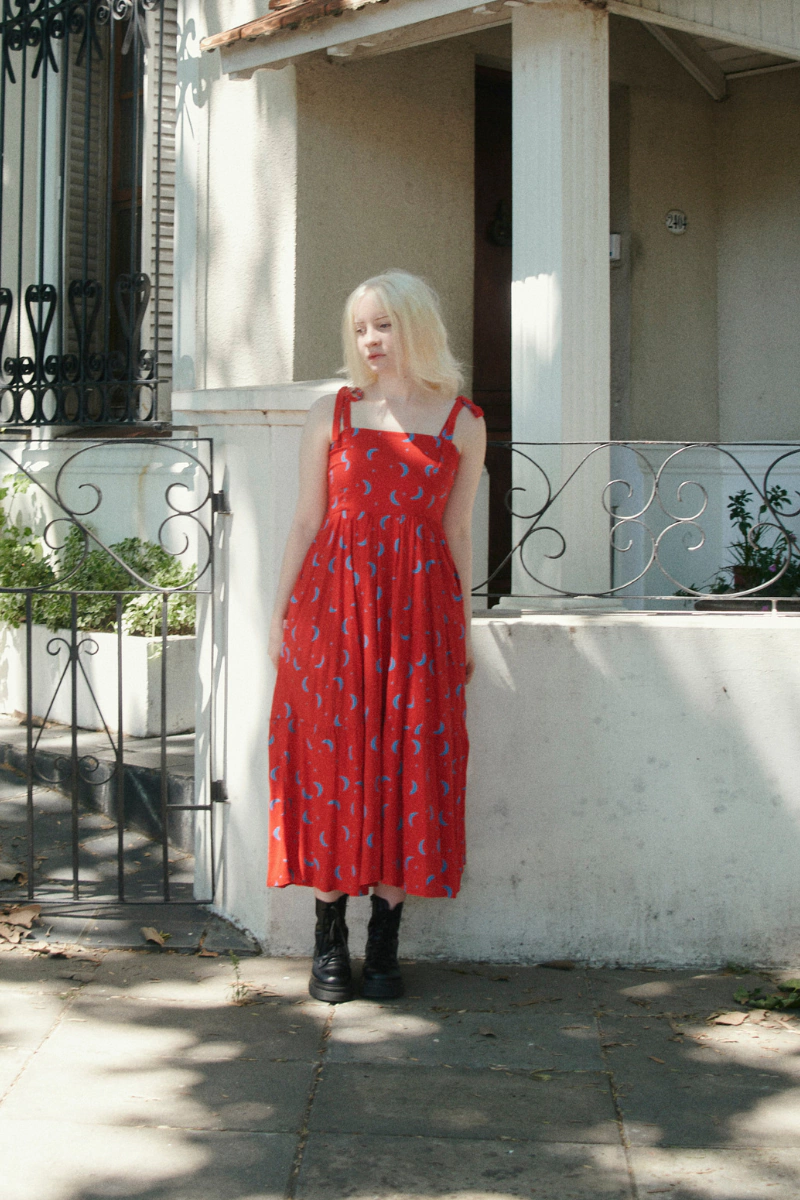 Vestido largo con breteles que se atan en el hombro y cierre invisible en la espalda. Tiene dos recortes de hilo elastico en la espalda para entallar, y tiene bolsillos.